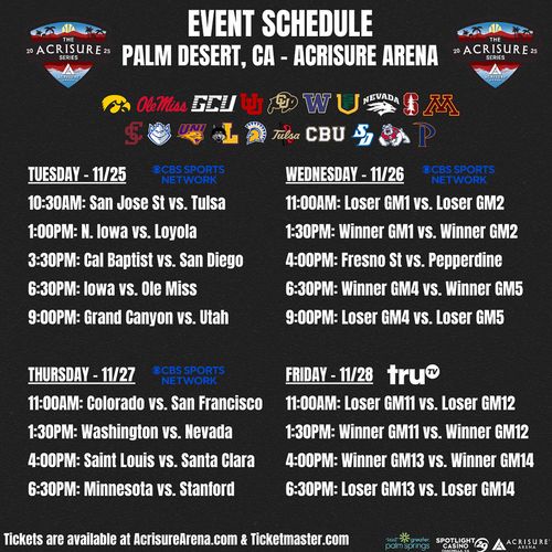 The Acrisure College Basketball Series is a premier annual showcase of NCAA Division I basketball talent, hosted in the Coachella Valley, California, at the state-of-the-art Acrisure Arena. Taking place over Thanksgiving weekend, the series features an exciting lineup of games that highlight some of the best men’s and women’s basketball programs in the country. Signature Events: Acrisure Classic, Acrisure Invitational, Acrisure Holiday Invitational, Acrisure Women’s Classic Event Details: Features 19 games across 4 days, providing top-tier competition for both men’s and women’s basketball. Played in the 10,000-seat Acrisure Arena, delivering an unmatched live experience for players and fans. Broadcast exclusively on TNT, truTV, and Max, ensuring national visibility for all games. The Acrisure Series is organized by Total Sports Consulting LLC, a leader in sports event promotions. Total Sports Consulting specializes in creating the best collegiate Division I men’s and women’s basketball events in the nation, delivering exceptional experiences for fans, teams, partners, and participants.